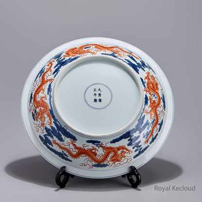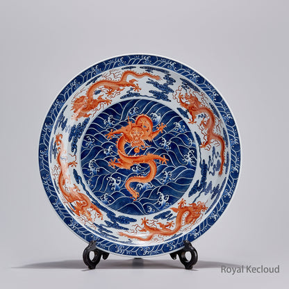 El plato tiene lados poco profundos y ligeramente redondeados, y está pintado en vibrantes tonos rojo hierro en el centro del interior con un sinuoso dragón de cinco garras que se retuerce en medio de olas azules bajo el vidriado, rodeado por otros cuatro dragones entre nubes que caminan alrededor del centro. El exterior está decorado con otros cuatro dragones.
