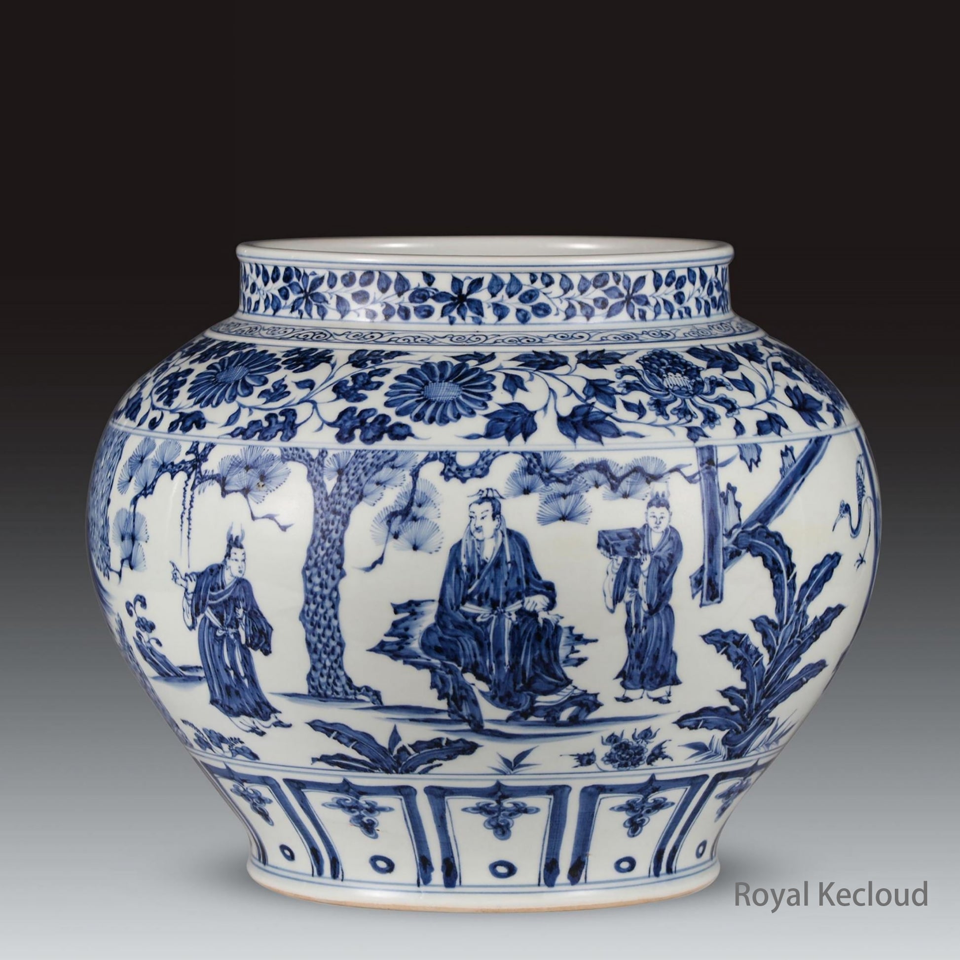 This jar shape thick full, dignified and majestic. The abdomen mainly depicts the Three Kingdoms period Liu Bei, Guan Gong, Zhang Fei three times to Zhuge Liang's hut to ask him to come out. The painting on the Jar was exquisite. Zhuge Liang sat on the rocks and listened to the family boy’s news. He stood beside him a book boy with two hands holding a book. Outside the fence, Liu Bei, dressed in embroidered robes, bowed and paid homage to him. Guan Yu looked back to stop Zhang Fei from shouting. Characters form, demeanor lifelike, is the Yuan dynasty blue and white in the best of the best.