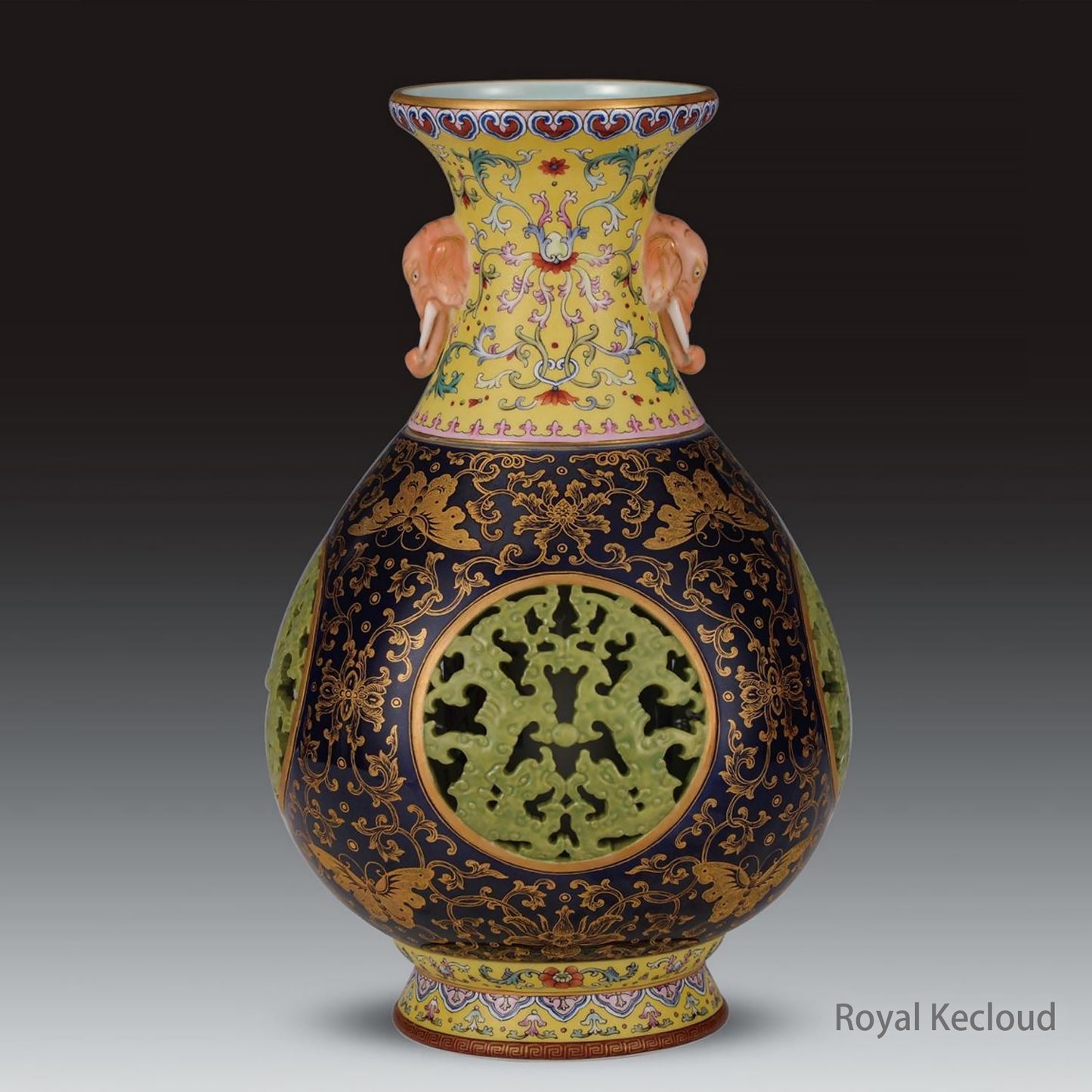 The reticulated revolving vase is decorated around the body with four openwork lattice medallions in lime green, set on a dark blue ground with stylized floral scrolls in gilt. The removable center is a theme of boys at play on a white ground. The neck decorated in yellow sgraffito ground, with lotus flowers and elephant head side handles.